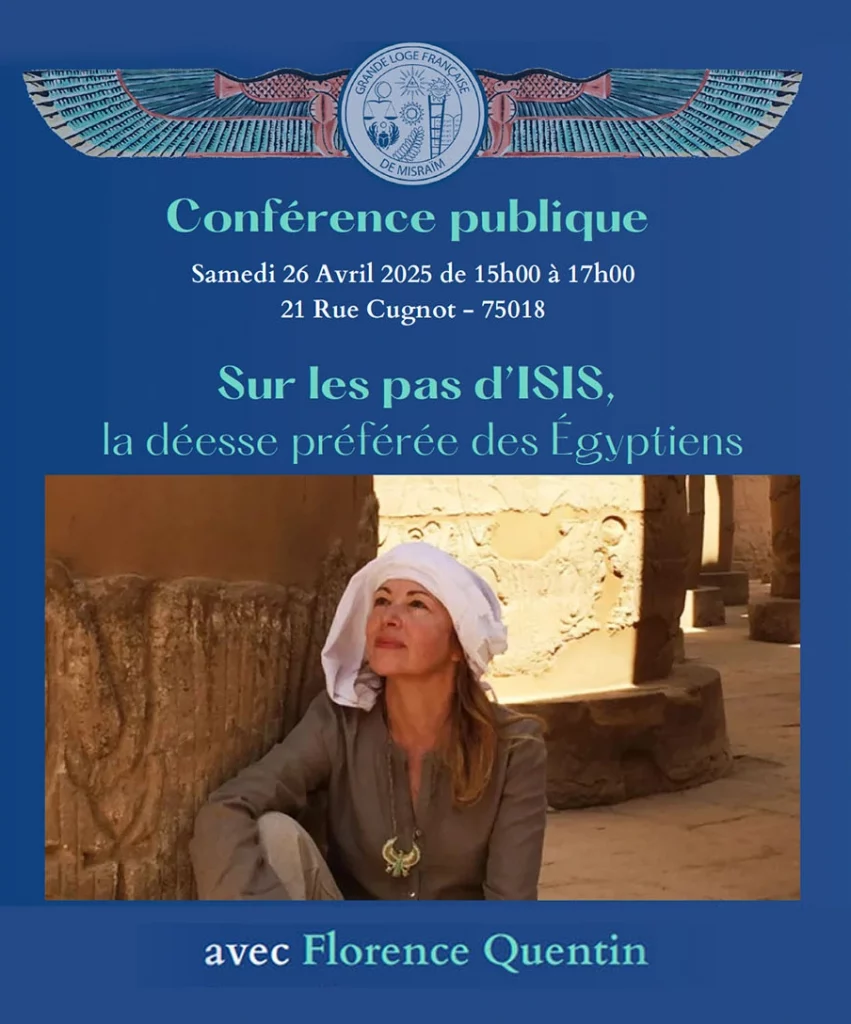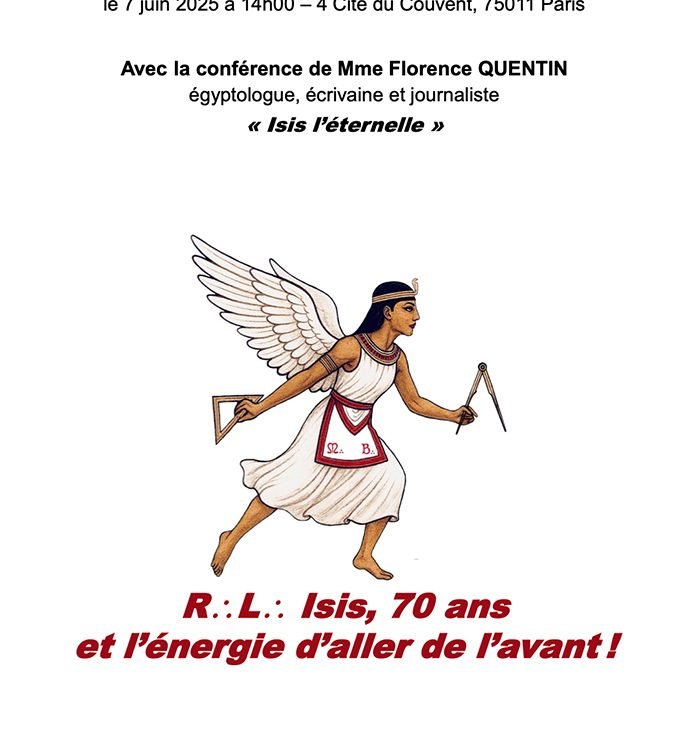 R.L. Isis N°9 à l’Orient de Paris, G.L.F.F. – R.E.A.A. Vous invite à partager sa Tenue d’Anniversaire le 7 juin 2025 à 14h00 – 4 cité du Couvent 75011 Paris Conférence de Florence Quentin, égyptologue, écrivaine et journaliste : “Isis l’éternelle” Triangle pour les agapes : 5 € (paiement sur place) Inscription obligatoire pour la Tenue et les Agapes: TBFisis.70ans@gmail.com